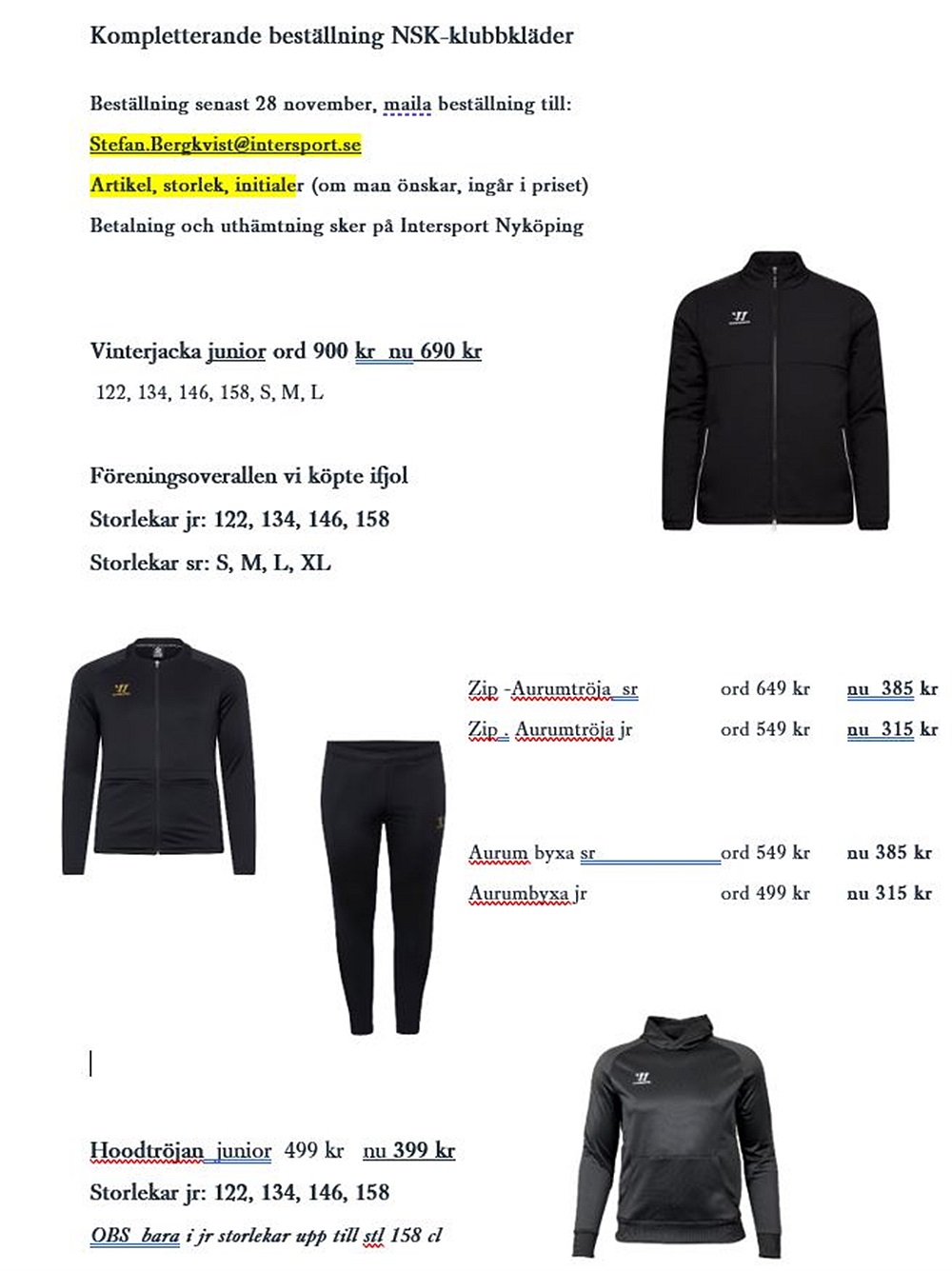 Tanken är att det ska gå snabbt och alla ska kunna få sina beställningar innan jul. Beställning ska ske innan fredag 28 nov med mail till Stefan.Bergkvist@intersport.se